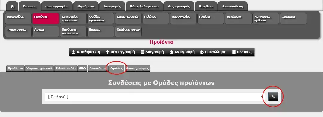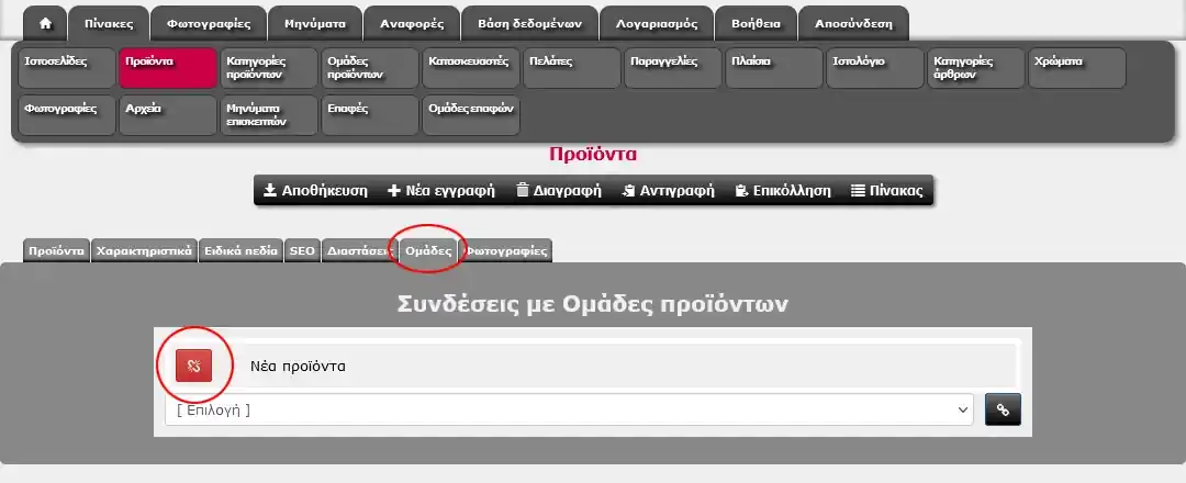 Για να συνδέσουμε κάποιο προϊόν σε κάποια ομάδα, επιλέγουμε την ομάδα από το πλαίσιο επιλογής και κάνουμε κλικ στο πλήκτρο [Σύνδεση] δεξιά του πλαισίου.